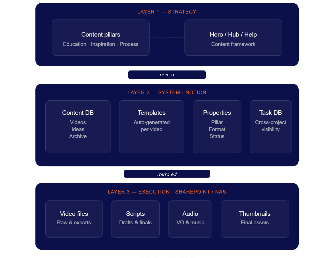 Establish a clear system architecture separating content management (Notion) from file storage (SharePoint/NAS) to eliminate version conflicts